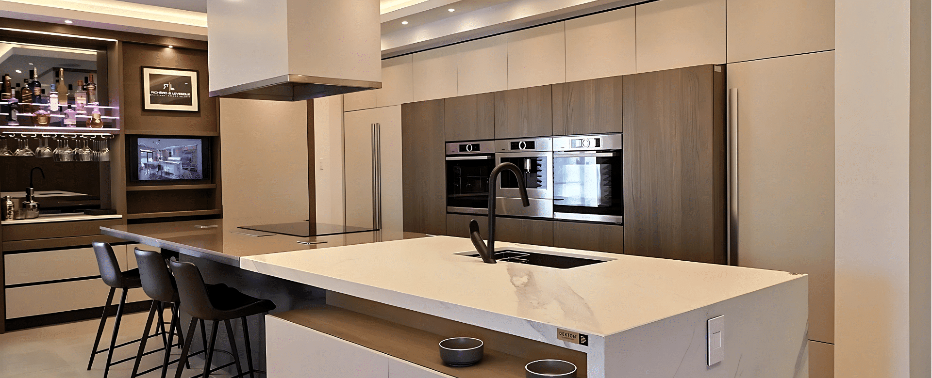 La combinaison du Hickory naturel et du Dekton Domoos confère à cette cuisine une esthétique sophistiquée et une allure intemporelle.