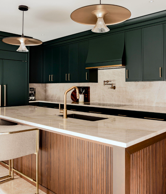 Autre différence marquante : le dosseret, souvent négligé ailleurs, est ici taillé dans la même pierre que le comptoir. Quartz, granit, Dekton — des matériaux durables, faciles d’entretien, qui offrent une cohérence visuelle sans couture.