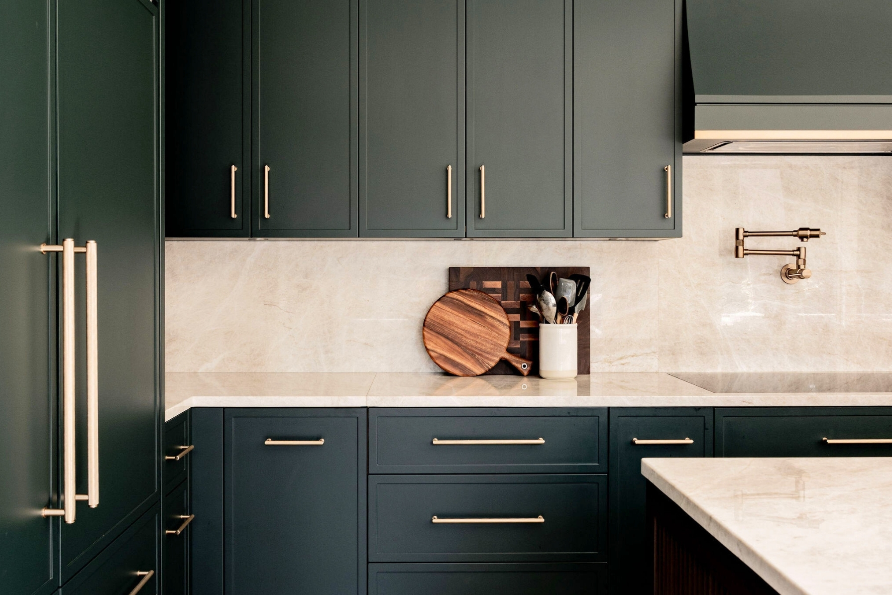 The natural stone brings every element of the design together. Extending from the countertop to the backsplash, the Taj Mahal creates a visual continuity that unifies this bold kitchen. Its soft tone balances the depth of the green and softens the overall look with natural elegance.