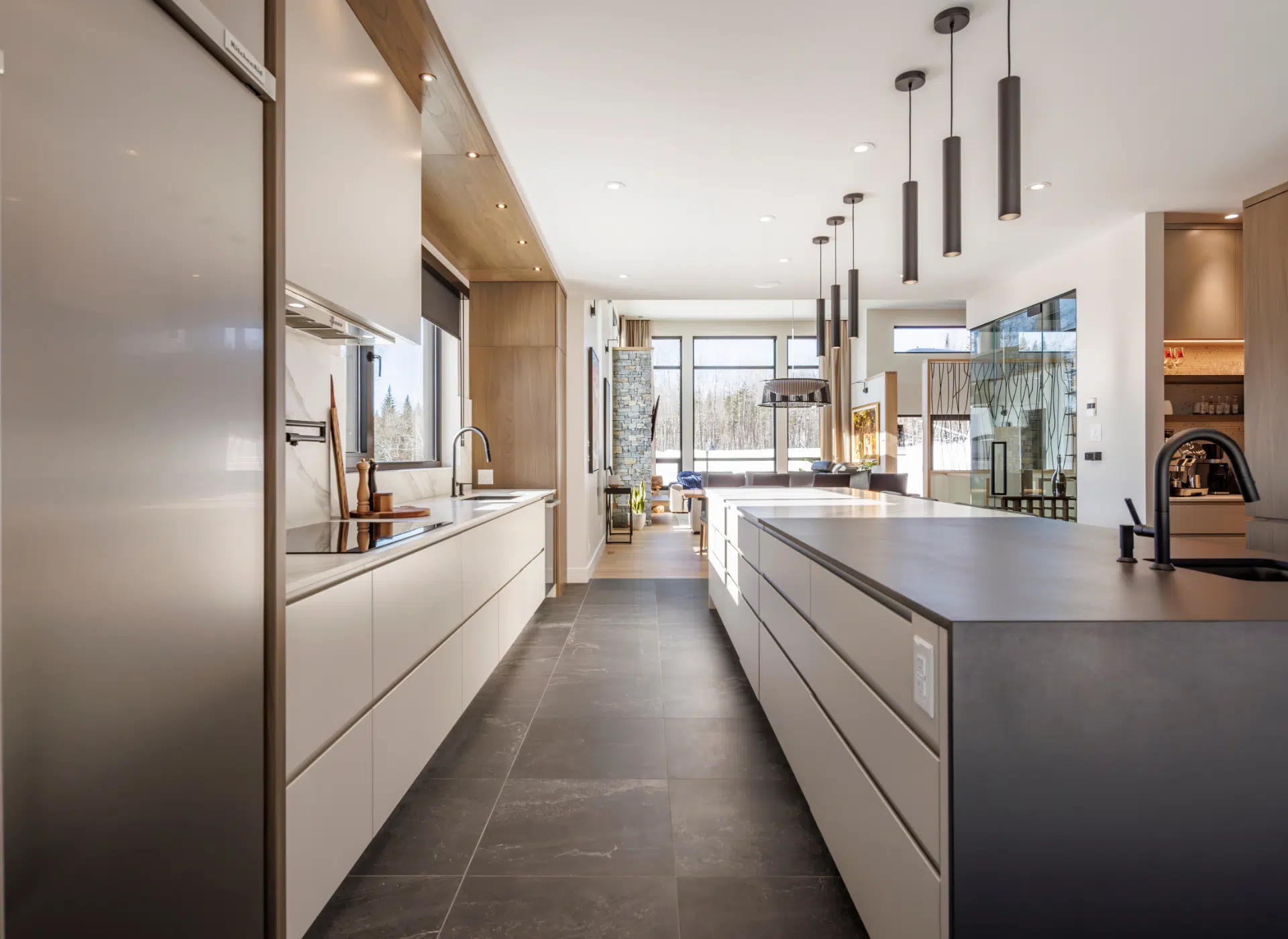 Ce projet met en lumière notre capacité à concevoir des espaces distincts mais parfaitement intégrés : une cuisine hautement fonctionnelle, un cellier vitré au design signature, un bar sur mesure, une salle de bain spectaculaire, un garde-robe walk-in et une salle de lavage complète — tous pensés dans un même esprit d’élégance cohérente et durable.