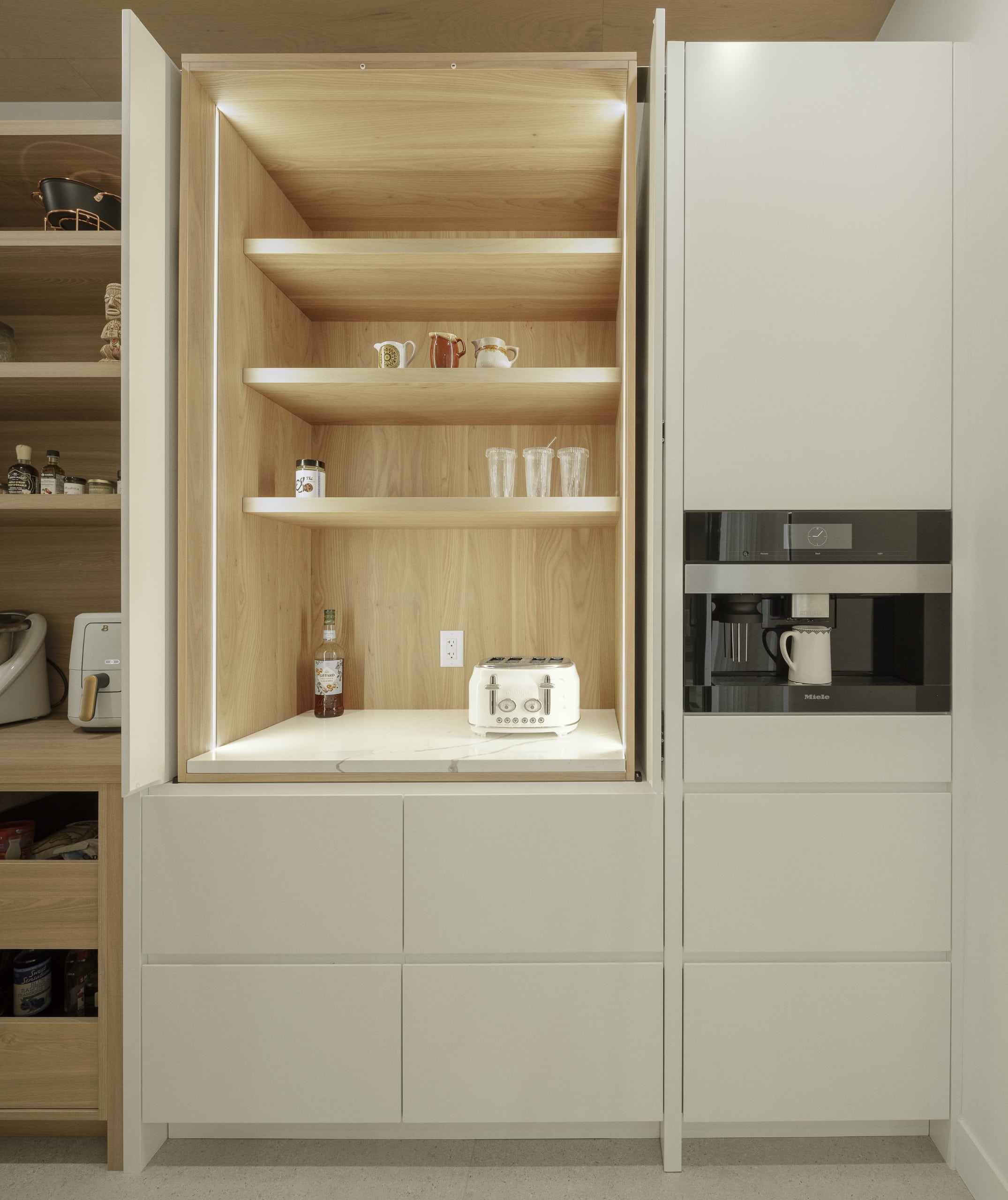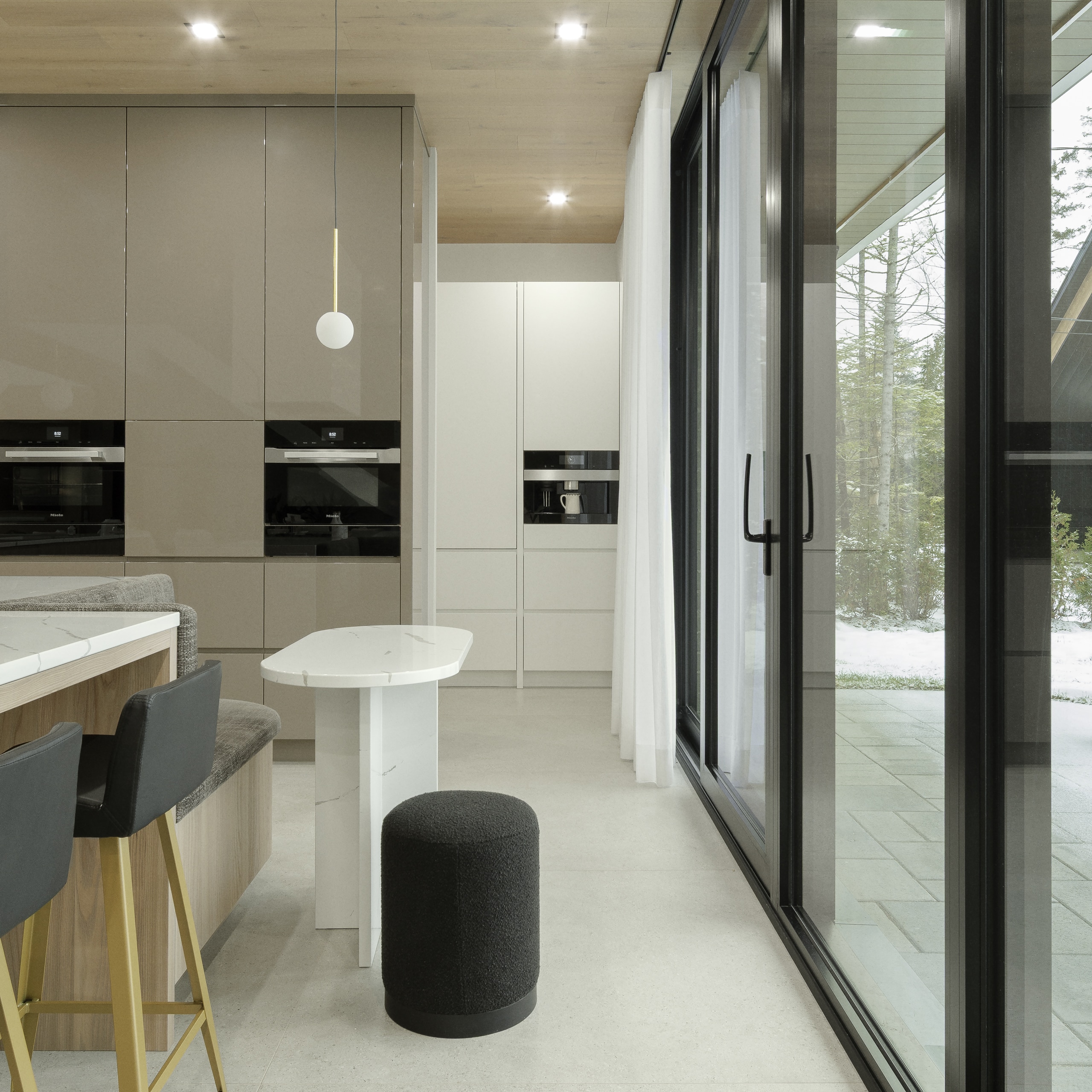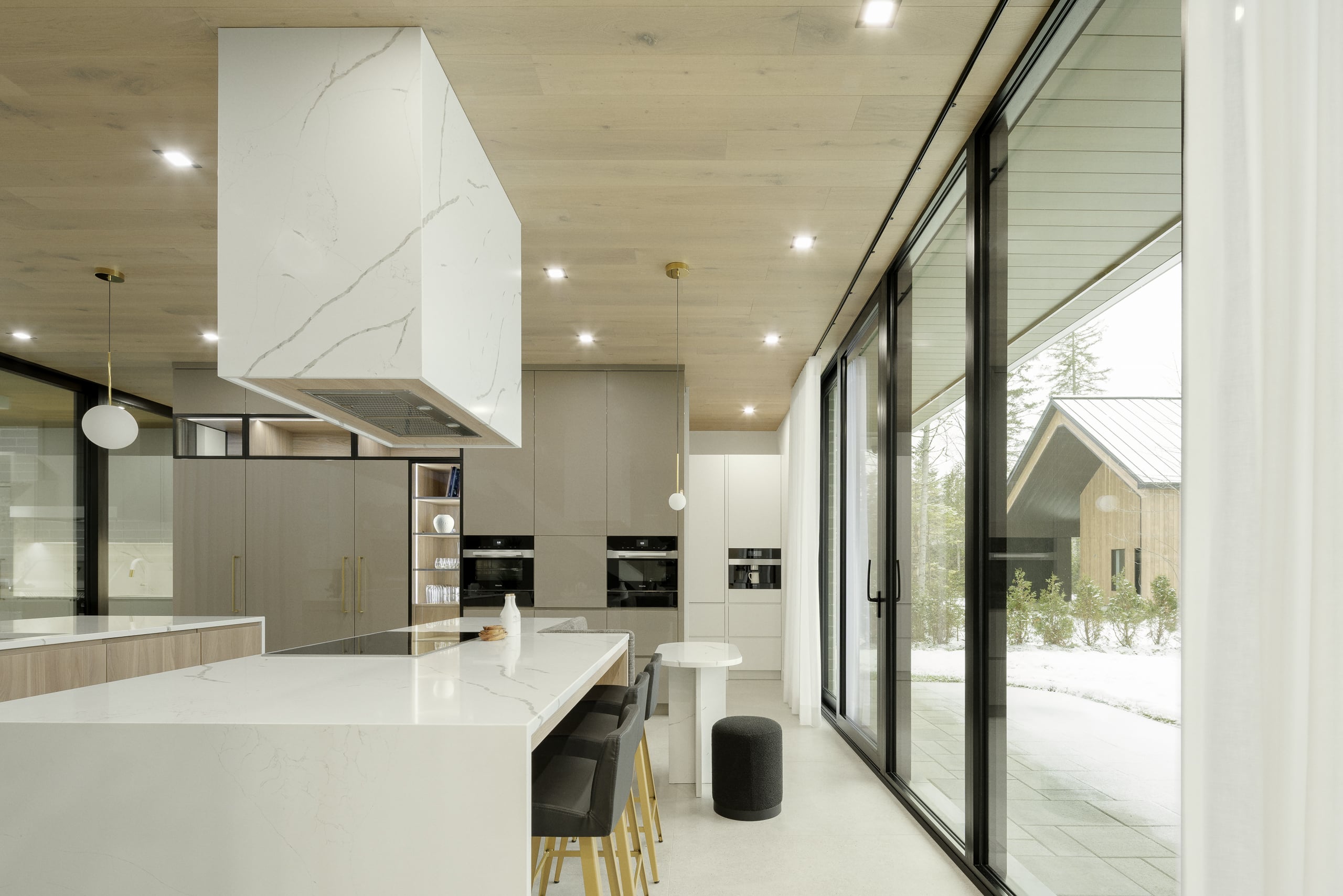 Le défi, c’était aussi d’intégrer une arrière-cuisine complète : deuxième lave-vaisselle, évier de service, électros secondaires, rangement pour les petits appareils, réfrigérateur pour les breuvages.