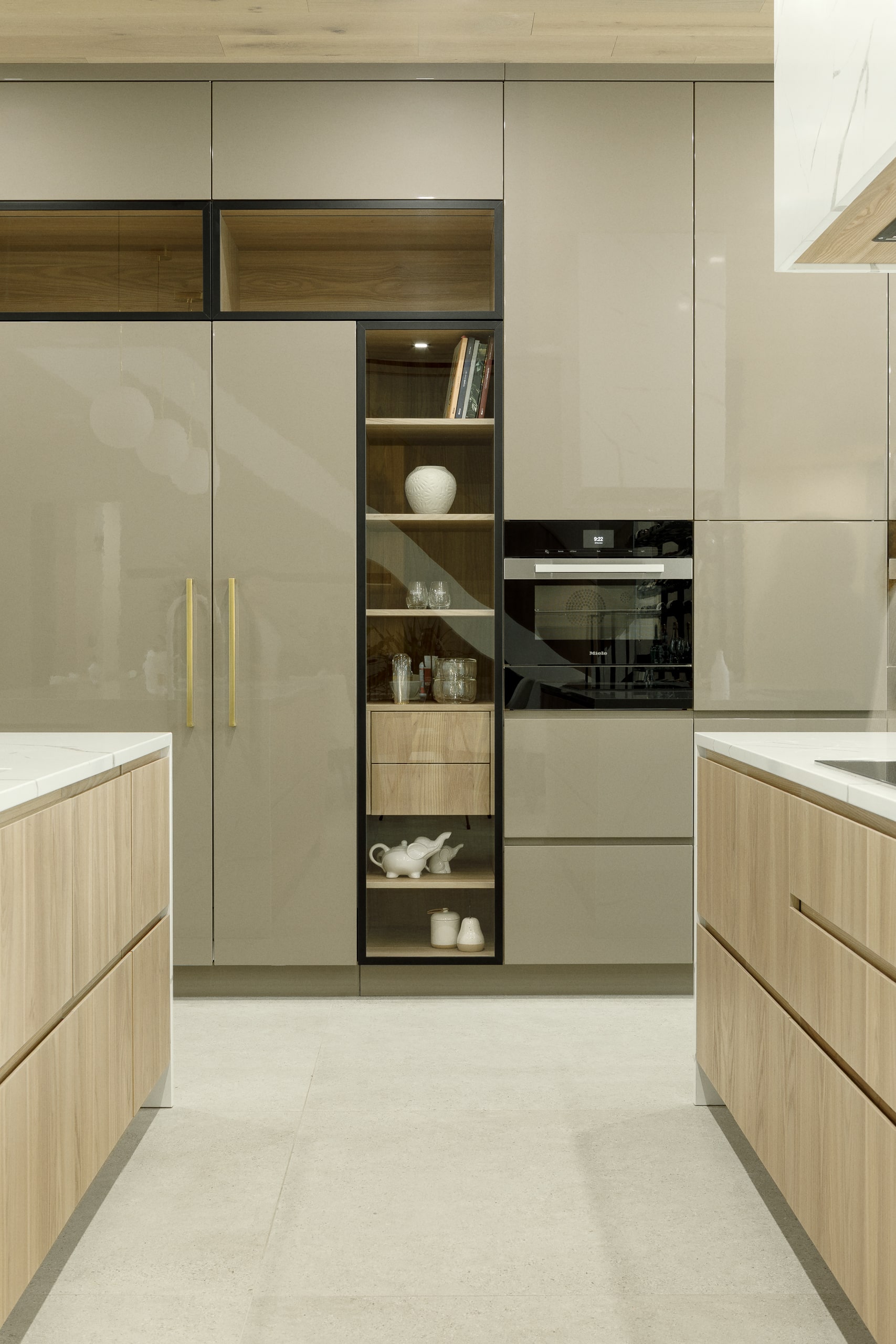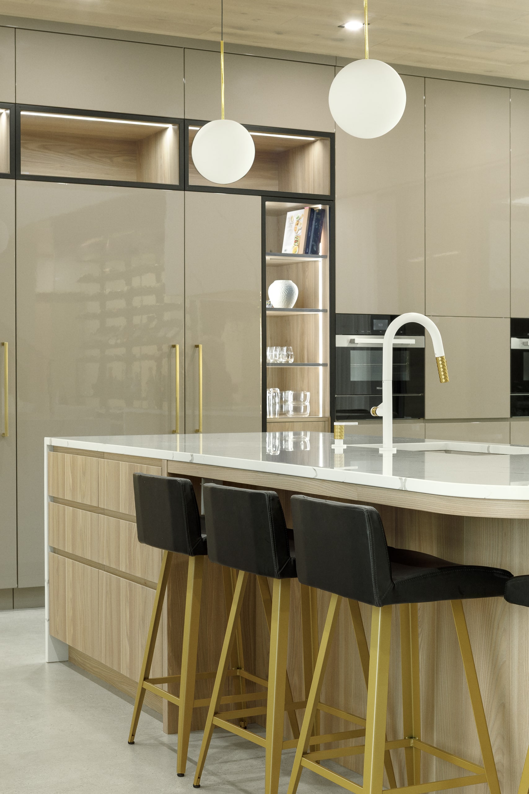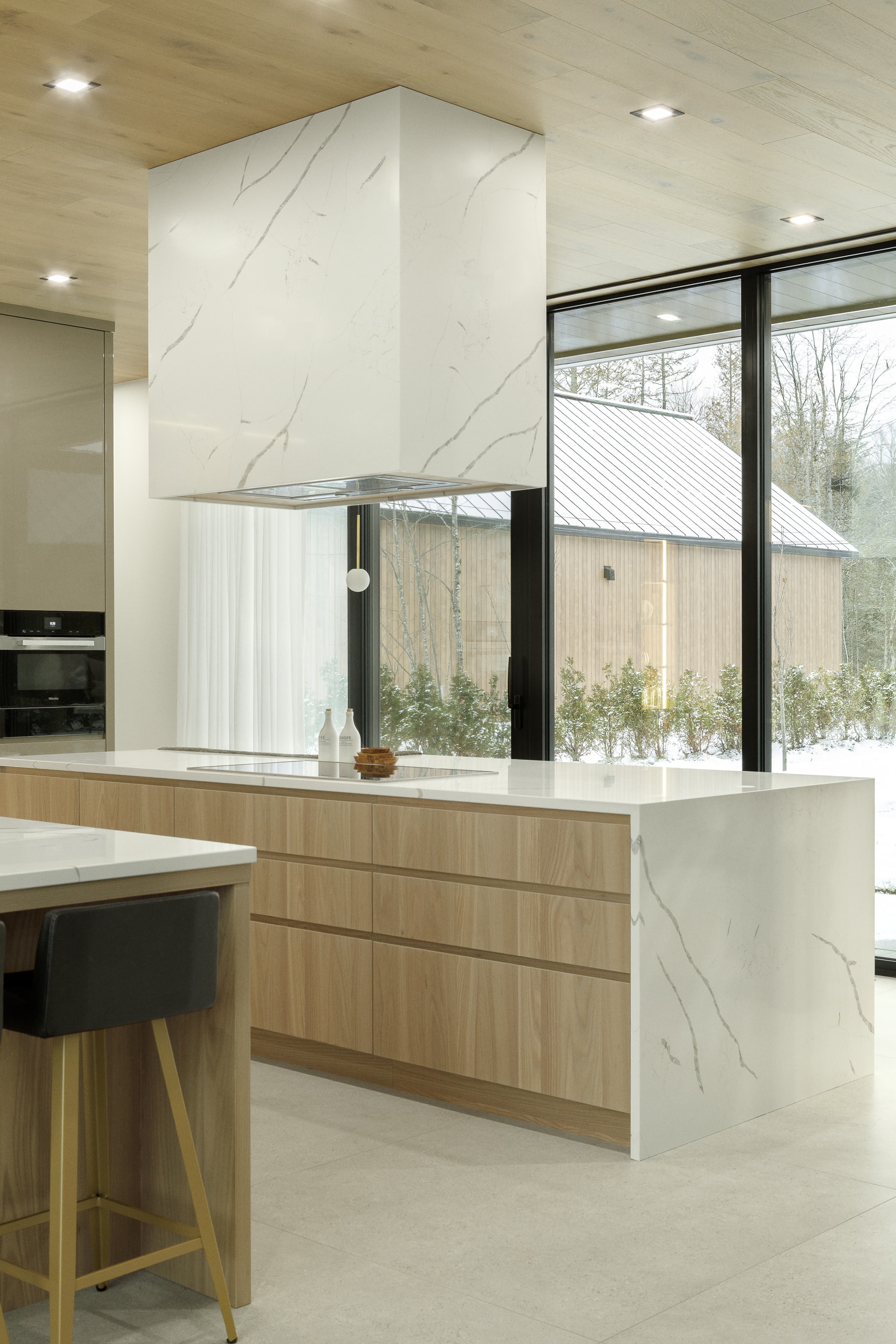 Le défi, c’était aussi d’intégrer une arrière-cuisine complète : deuxième lave-vaisselle, évier de service, électros secondaires, rangement pour les petits appareils, réfrigérateur pour les breuvages.